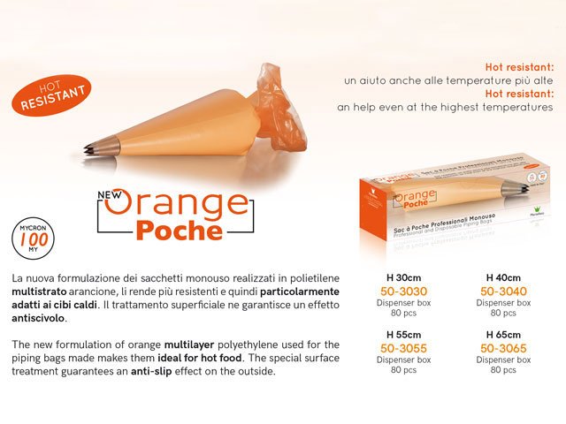 Nova formulacija narandžastog višeslojnog polietilena koja se koristi za ove vreće čini ih  idealnim za toplu odnosno vruću hranu. Specijalni tretman površine vreće   pruža efekat protiv klizanja.